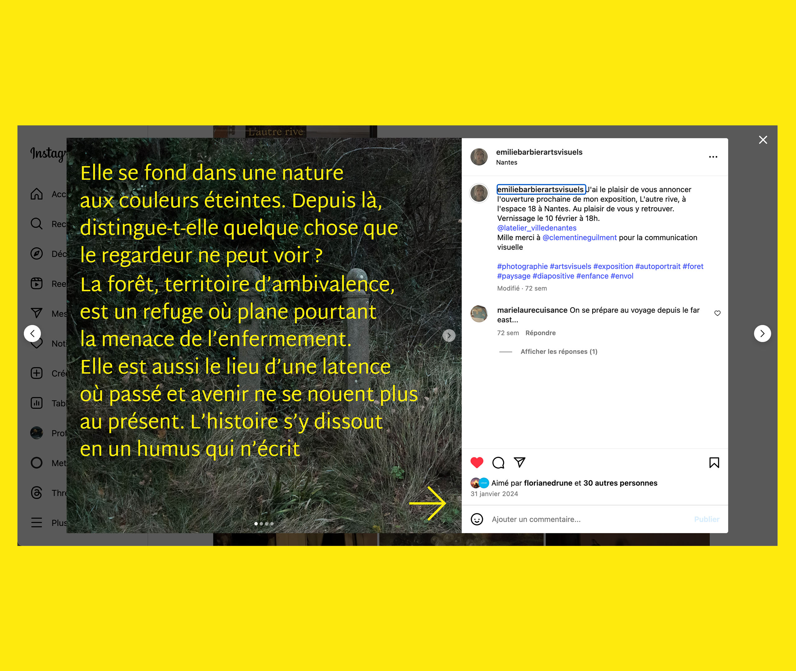 Photographie Exposition 2024 Direction artistique Réalisation d’un kit de communication pour l’exposition de la photographe Émilie Barbier : affiche, kit de communication réseaux sociaux (stories et post) et reportage photo lors du vernissage.